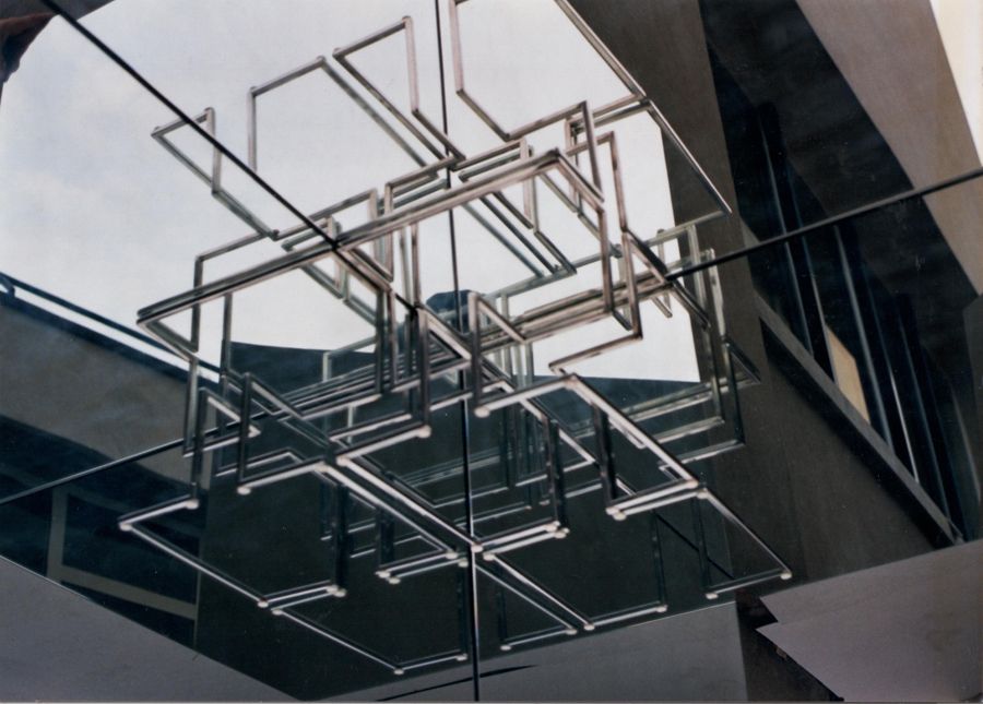 Cubic labyrinth on mirror, 1996. Steel, 60x60x60 cm