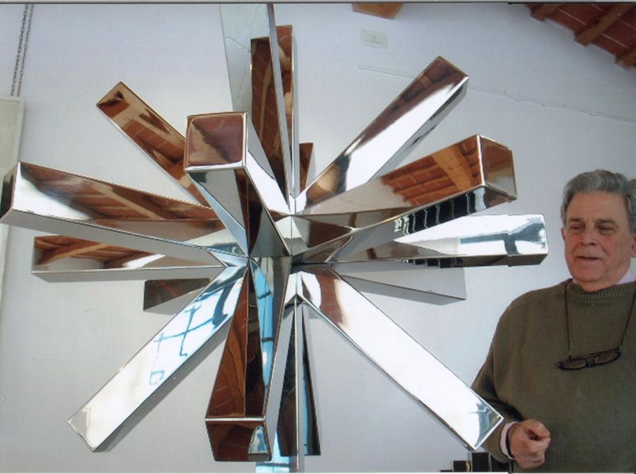 […] Paolo Scirpa has conceived a shape recalling the concave mirror. He uses mobile metal elements, with dazzling brightness that reflects light in first place, and then generates a remote feeling of perfect form/idea, so perfect as to capture the sun and utilize it for the city’s necessities, as if science were a civil virtue. The circular-arc arches, mobile “segments” in his sculpture, give this work characteristics of constant change. The artist utilizes an initial, visible, complete and archetypal form – the concave circle, so similar to the disc of the sun whose “soul” he wishes to capture – and presents a physical, potentially infinite physical deterioration. Every segment is independent in its variable position. It is the archetypal form that precedes and looks ahead to the idealized, mental reconstruction of the work.[…]