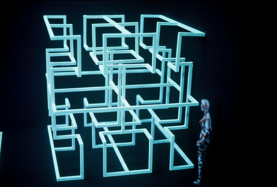Labirinto cubico su piano speculare, 1996. Acciaio inox, 60x60x60 cm